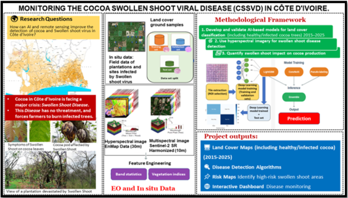 Dr. Amandine Carine Njeugeut Mbiafeu is a Cameroonian researcher at CURAT (Centre Universitaire de Recherche et d’Applications en Télédétection) in Côte d’Ivoire with a PhD in Remote Sensing and GIS, specialized in Climate, Environment, and Sustainable Development. As a consultant and lecturer, she focuses on natural risk management and land cover change monitoring. Within ARF, her project focuses on monitoring the Cocoa Swollen Shoot Viral Disease (CSSVD) in Côte d’Ivoire, with a particular focus on the Soubre region, the most affected area. Her work applies hyperspectral and multispectral imagery together with deep learning models to design early warning approaches, analyze the disease’s spatial dynamics, and evaluate its impact on cocoa production and food security.