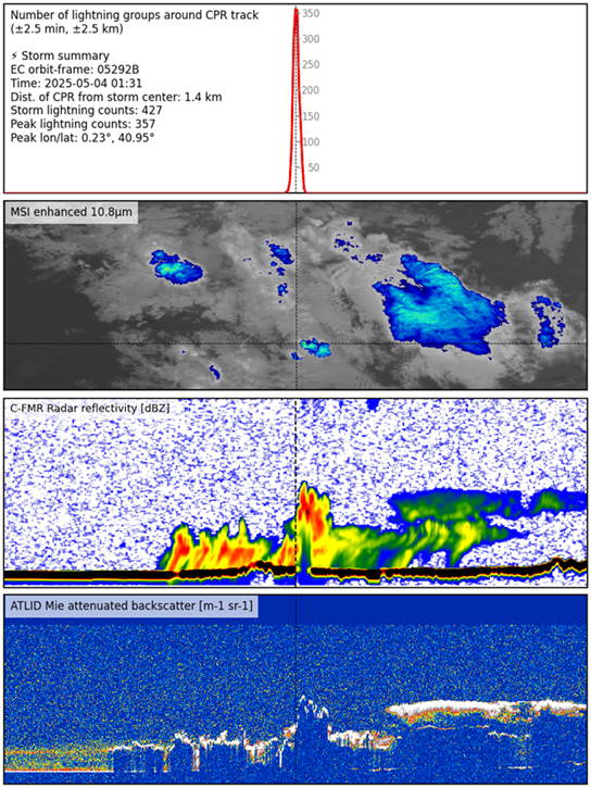 EarthCARE provides detailed vertical profiles of clouds, aerosols and precipitation using a combination of radar, lidar and multi-spectral imaging. Geostationary lightning sensors, on the other hand, continuously monitor lightning activity across Europe, Africa, the Americas, and the adjacent oceanic regions with remarkable temporal precision.